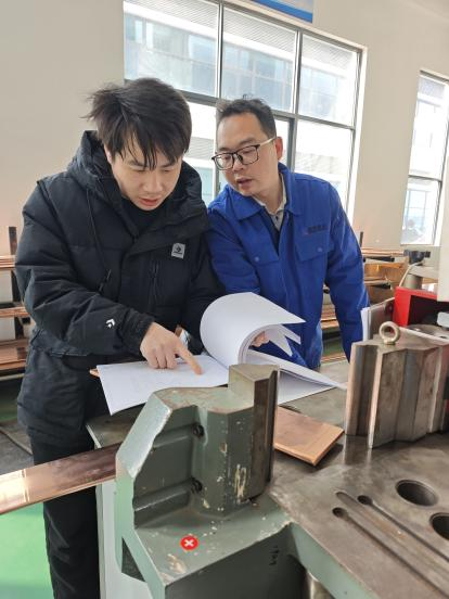 理论宣讲结束后,培训转入实操指导环节。以 “一对一” 的模式,依次开展一次线、二次线装配及铜排制作示范操作。郭主管分别挑选出制作一次线、二次线和铜排的老师傅,对车间新进员工进行一对一示范和指导;参训人员认真观摩、主动记录,结合自身实操疑问积极提问,老师傅们耐心解答,手把手指导大家纠正操作偏差,确保每位参训人员都能看懂、会操作。